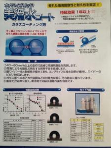 撥水効果1年以上を実現! ①40~60km/h以上の走行で良好な雨滴飛散性をします ②雨滴による光散乱で発生する視界不良を低減します ③ロングライフな撥水効果、ワイパーのビビリを低減します ④ガラス面の水アカや油膜などの付着力が低く、汚れ除去に優れています ⑤着氷力が低く、寒冷地での氷剥離作業が容易です 作業工賃 9,800円 |