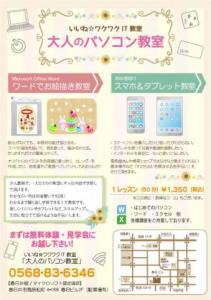 ![]() この秋、春日井でいままでにない新しいパソコン教室が始まります! パソコン、スマートフォン、タブレットで、 分からないことが“分かる”、やりたいことが“できる”ステップアップ教室です。 初めての方でも安心の楽しいレッスンがあります。 オフィスソフトのワードをお絵描きツールとして使いこなす! 自分だけのオリジナルグッズまで作れる! 『できる』『やりたい』自分に出会ってください! まずは8月の無料体験・見学会で、レッスンの楽しさを体験ください。 +゚*。:゚+.゚*。:゚+.゚*。:゚+.゚*。:゚+.゚*。:゚+゚*。:゚+.゚*。:゚+.゚*。:゚+. ☆★☆無料体験・見学会日程☆★☆ ●開催日 8月23日(水)・24日(木)・30日(水)・31日(木) ●開催時間 9:30~12:00/13:00~15:00 ●場所 春日ビル/2階会議スペース 春日井市鳥居松町4-168【春日井市役所南 徒歩3分】駐車場あり ※予約制(無料体験会・お申込み受付中)TEL:0568-83-6346までご連絡下さい。 ※見学は自由に行っていただけます。(昼休憩を除く)14:30までには見学にお越しください。 ■講師プロフィール 泉 真美代【マイクロソフト認定トレーナー】 市町村での市民講座や学校・教育関連のIT講習、パソコン教室の講師を務める。 一般企業や団体へのパソコン教室からエキスパートなオフィスソフト講習までを幅広く指導を行う。 ☆取得資格 MOS オフィスマスター取得 MCT-IW取得 他、資格多数 +゚*。:゚+.゚*。:゚+.゚*。:゚+.゚*。:゚+.゚*。:゚+゚*。:゚+.゚*。:゚+.゚*。:゚+. 【新規会員お申込み受付中!】 ただ今、入会金無料キャンペーン実施中!(9月末まで) ☆入会金 税込3,240円が、今なら0円! ======================================= ■お問合せ・お申込み 株式会社 EYEX(アイックス) 春日井市篠木町5-23-1 TEL 0568-83-6346 http://www.eyex.jp/ ======================================= |