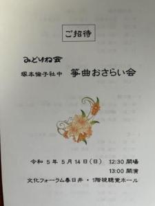 5月14日(日)13:00より文化フォーラム春日井・視聴覚ホールで塚本倫子社中の箏曲おさらい会を開催致します。 日頃の練習の成果を充分発揮出来るよう頑張ります。 お時間のある方は聴きに来て頂けるとうれしいです。 |