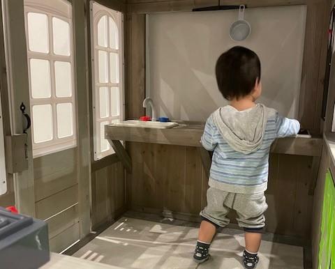 キッズスペースの木製プレイハウスでお子さまも楽しく遊べます♪