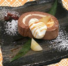今週のロールケーキは、ココアの生地に、苦味のきいたキャラメルクリームと洋梨を巻き込んだ☆キャラメルポワール☆大人の秋をお楽しみください~(^w^)