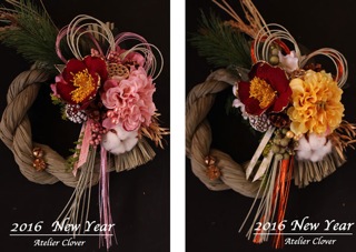 椿とダリアのお花をメインに、縁起の良い水引や蓮の実なども入り華やかですよ。